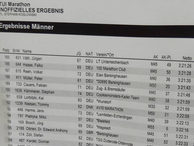 Neues Rathaus 13.28 Uhr Auf dem Ergebnisdruck war meine Zeit sogar noch um zwei Sekunden schneller als ich gestoppt hatte: 3:21:28 Stunden Die zweite Hälfte war ich in 1:38:46 Stunden gelaufen. Das war der schnellste Halbmarathon, den ich jemals während eines Marathons gelaufen bin. |