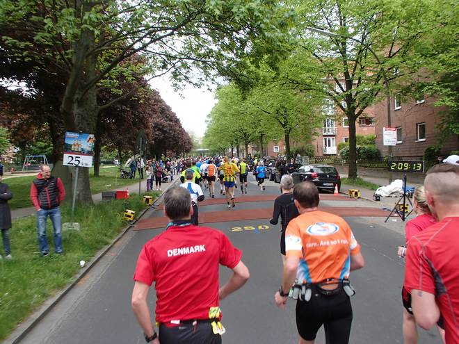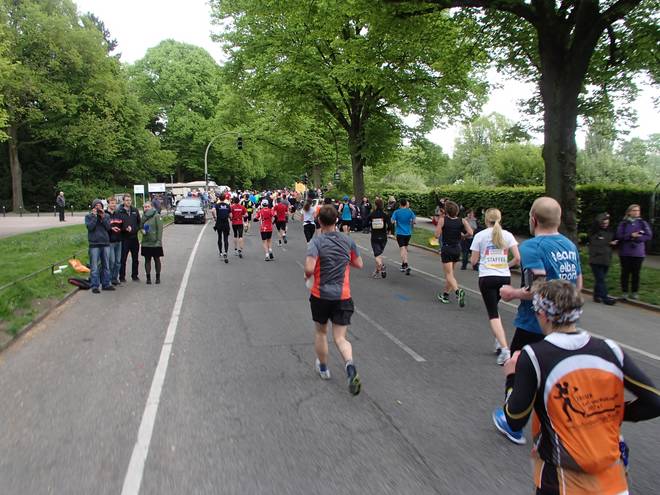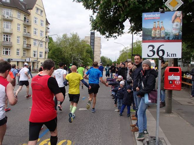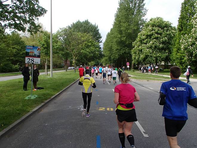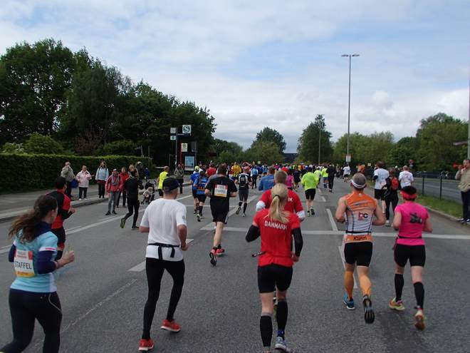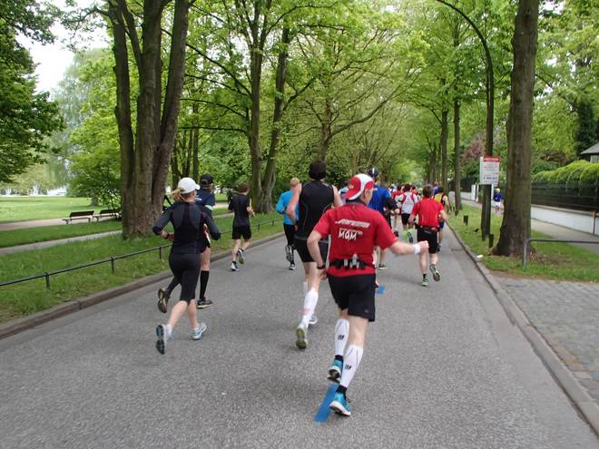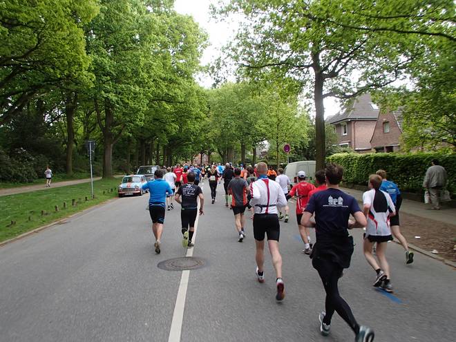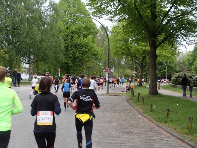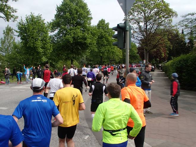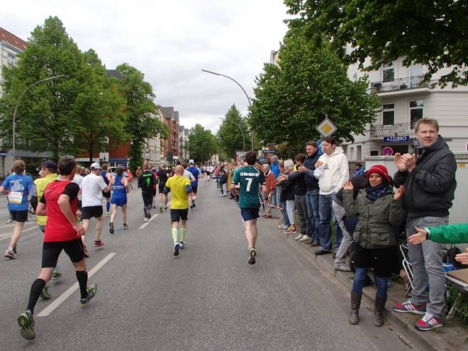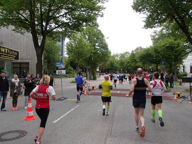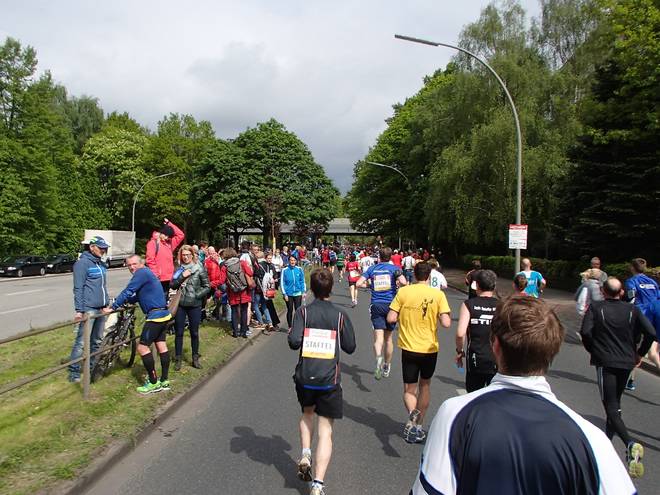 Am Hasenberge 11.39 Uhr / Km 31,1 Das zieht sich von der Rathenaustraße am U/S-Bahnhof Ohlsdorf vorbei bis über die Alster in den Maienweg hinein. Ist wohl auch ein Grund, warum so wenige Läufer in Ohlsdorf in die Bahn umsteigen, obwohl es kaum einen bequemeren Platz zum Aufgeben gibt. |
