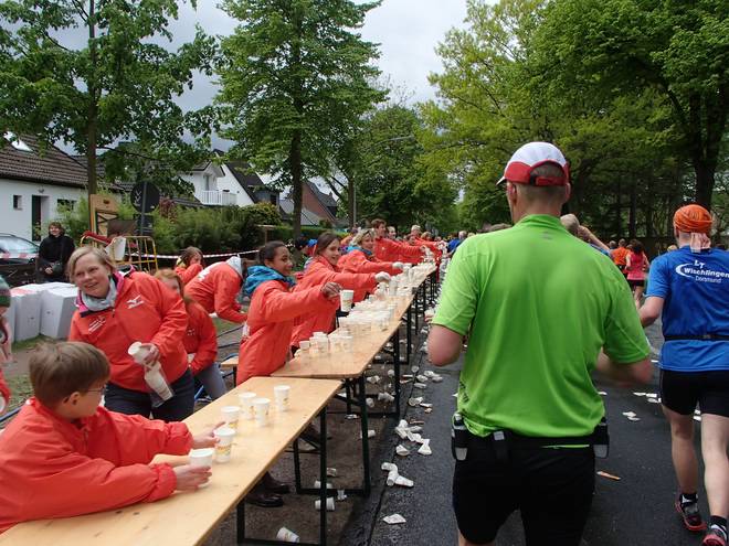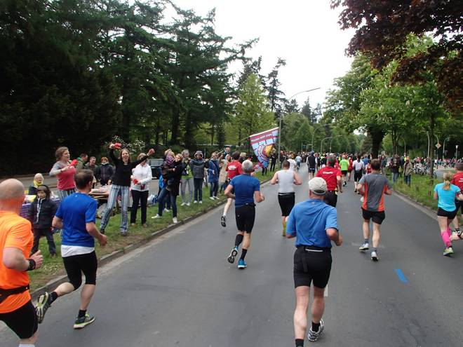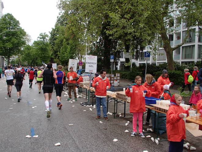 Rathenaustraße 11.33 Uhr / Km 29,8 Und wieder einer diese vollen Verpflegungsstände. Sogar Coca-Cola gab es. Die war auch dringend erforderlich, wenn ich das Tempo halten wollte. |