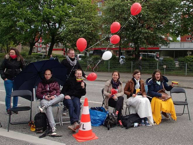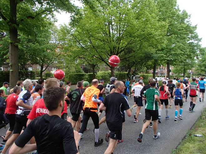 Maienweg Alsterkrugchaussee 11.50 Uhr / Km 33,5 Der erste Versuch, auch an den Ballons vorbei zu kommen, schlug fehlt. Bis zur nächsten Engstelle war nicht genug Platz zum Überholen. Oder anders ausgedrückt: ich war nicht schnell genug. |
