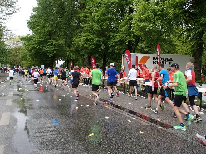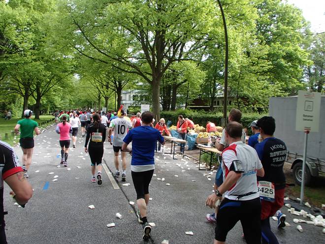 Alsterkrugchaussee 11.56 Uhr / Km 34,7 Jetzt mußte ich nur aufpassen, daß ich hier beim nächsten Verpflegungsstand nicht gleich wieder überholt wurden. Diese Tempoläufer sind für sehr kurze Trinkpausen bekannt. |