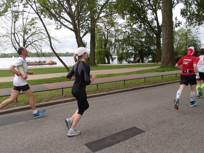Gorch-Fock-Wall 12.29 Uhr / Km 41,4 Auch wenn die Dame mit dem weißen Cappy mich hier (zwischenzeitlich) überholt, in der Regel überhole hier fast nur ich. |