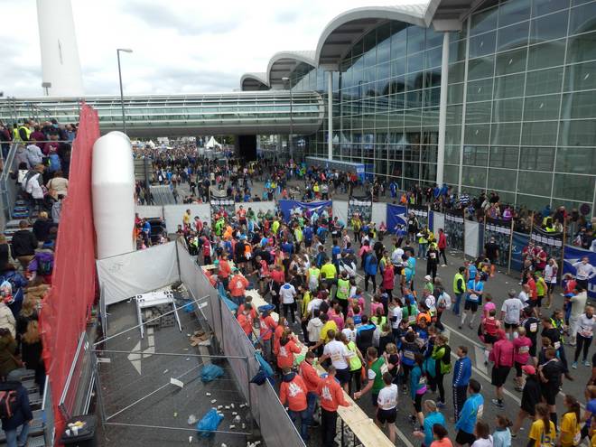 Karolinenstraße 13.48 Uhr Auf der linken Seite liefen die Staffeln ins Ziel. Auf der rechten liefen der Marathonies. Die Staffeln durften die letzten 400 Meter zusammen laufen. Da hatte man extra einen Treffpunkt eingerichtet, ab dem die Team zusammen laufen durften. |