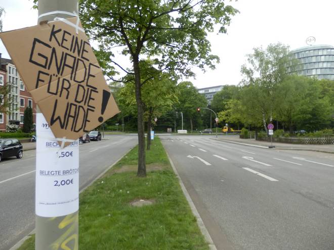 Sydneystraße 14.24 Uhr Während an den Messehallen immer noch Läufer ins Ziel strömten, war hier bei Km 28 schon alles wieder ruhig. Nur die Schilder erinnerten noch an den Marathon. |