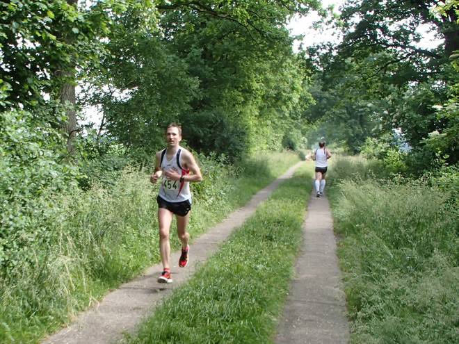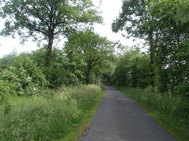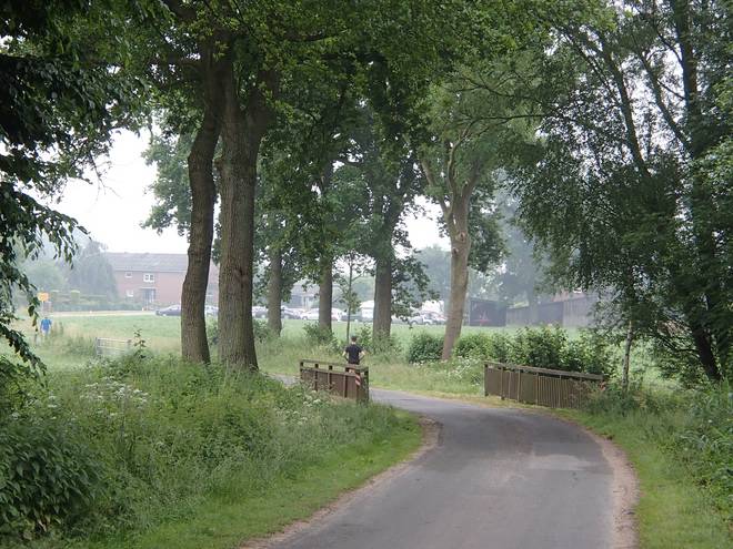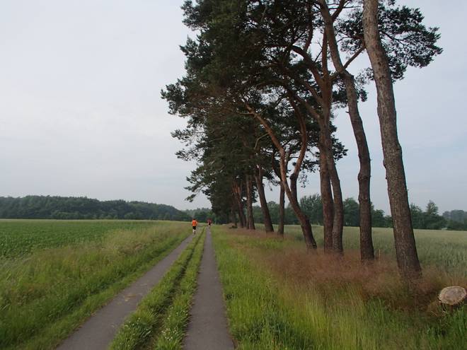 Voßmoorstraße Runde 2 9.39 Uhr / Km 5,8 Auch bei 19°C waren die ersten beiden Runden sehr schweißtreibend. Nach dem Regen am Vorabend stand die Feuchtigkeit über dem Boden. Und so fast ohne Wind war das nicht sehr schön. |