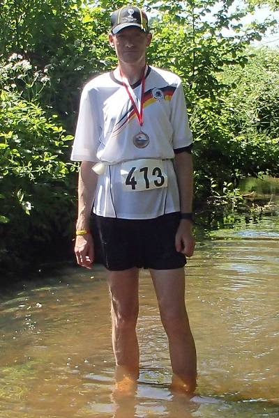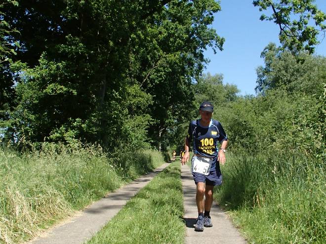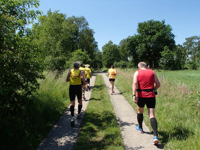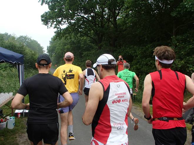 Im Voßmoor Runde 6 11.11 Uhr / Km 22,4 Ich war prima unterwegs. Auch bei zunehmender Wärme ging es mir noch gut. Ich hatte mir einen Schwamm geschnappt und packte ihn mir mit Wasser gefüllt unter das Cappy. Immer am Rundenbeginn. Das war mir in Darmstadt im Knast eingefallen und klappt auch in Langeln gut. |