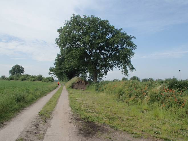 Voßmoorstraße Runde 5 10.43 Uhr / Km 17,3 Und hier das Grab noch einmal bei besserem Licht. es hat einen Durchmesser von 25 Metern und ist vier Meter hoch. Vermutlich stammt es aus der Bronzezeit, ist also 2500 bis 3500 Jahre alt. In der Nähe gibt es noch drei weitere Hügelgräber, die aber nicht mehr so gut erhalten sind. |