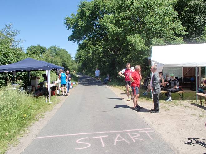 Heidkaten Runde 1 9.28 Uhr / Km 3,9 Das Ende jeder Runde war etwas heikel. Erst ging es auf eine kleine Stichstraße mit einer engen 180-Grad-Wende. Und zurück auf der Hauptstraße ging es in einer weiteren engen Kurve 170 Grad auf die Start-Linie zu. |