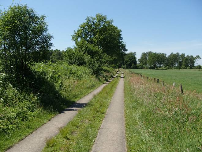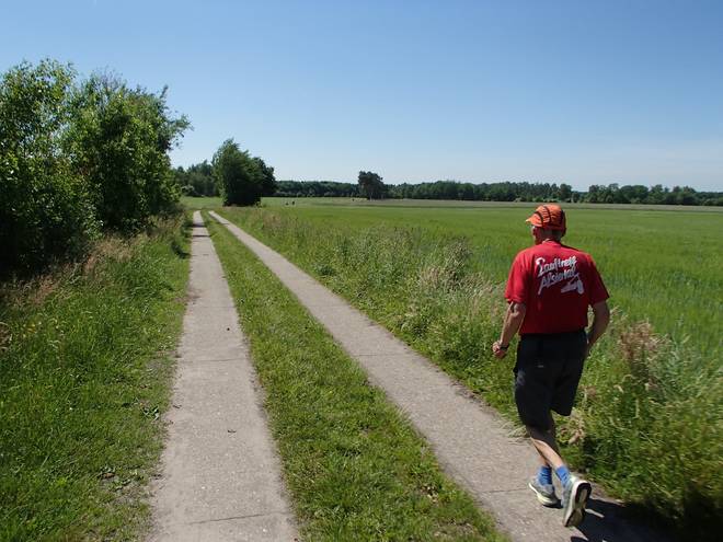 Im Voßmoor Runde 1 9.13 Uhr / Km 1,3 Dann ging es im Bogen erst nach Westen und dann nach Süden über die Felder auf einer gut zu laufenden Zweispurbetonbahn. Der Mittelstreifen war etwas heikel. Aber den konnte man auch überspringen. |