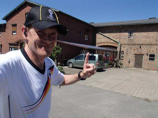 Im Voßmoor Runde 6 11.17 Uhr / Km 23,4 Auf dem mp3-Player hatte ich das Hörspiel "Das Wunder von Bern" dabei. Drei Tage vor dem Beginn der Fußball-WM 2014 in Brasilien paßte das. Zu meinem Fußball-Trikot sowieso. |