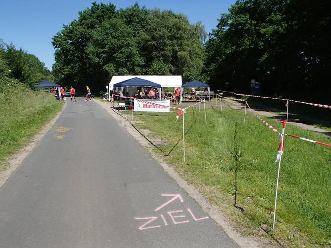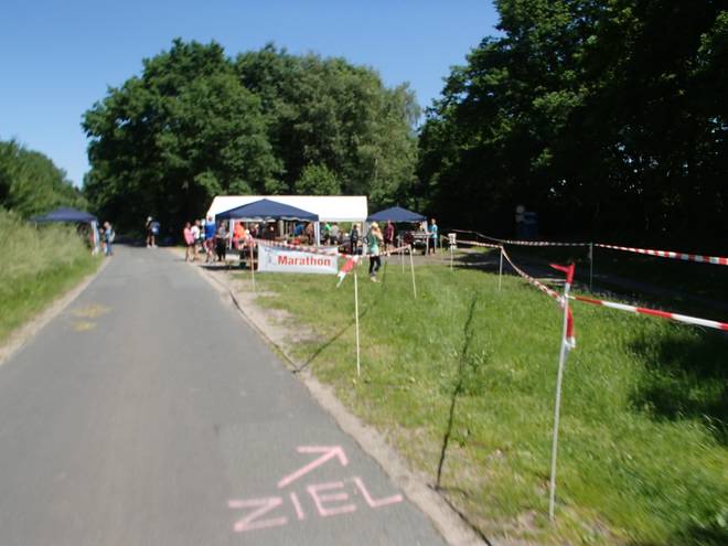 Voßmoorstraße Runde 10 12.58 Uhr / Km 42,15 Letzte Kurve war auch geschafft und nun ging es die letzten Meter nach rechts in den Kanal auf Rasen ins Ziel. |