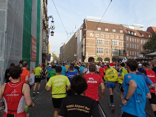 Bürgermeister-Smidt-Straße 10.00 Uhr / Km 3,0 Ich wollte mich am Konzept vom Hannover-Marathon 2014 orientieren. An den Ballons dranbleiben und dann mal sehen, was nach vorne noch möglich war. Am 27.04.2014 lief ich damit 3:21:28 Stunden. Meinen bis dahin zweitschnellste Zeit überhaupt. |