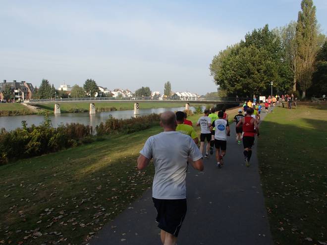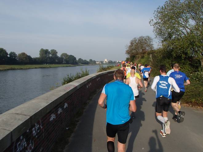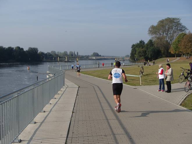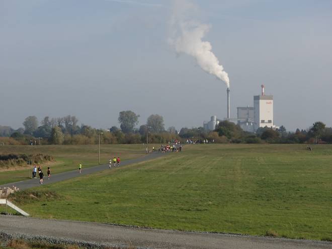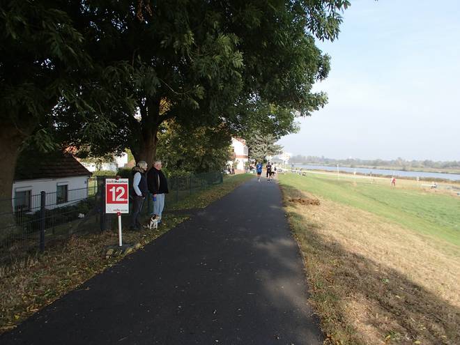 Hastedter Osterdeich 10.50 Uhr / Km 13,9 Nun ging es eine kurze Strecke an der Weser entlang. Und auch etwas bergab. |