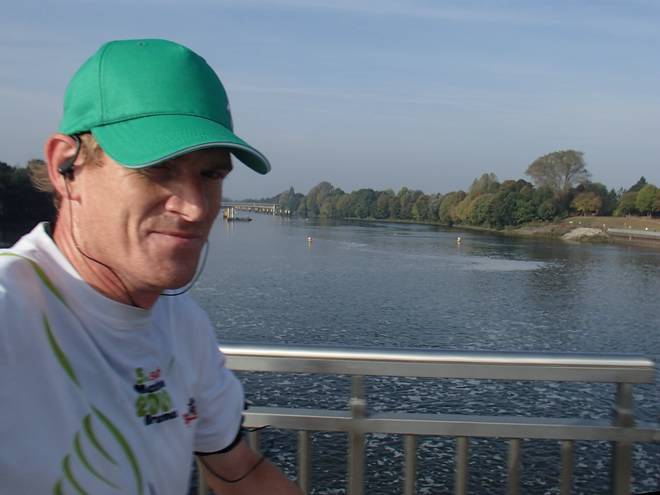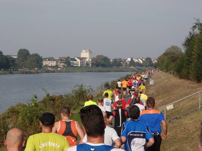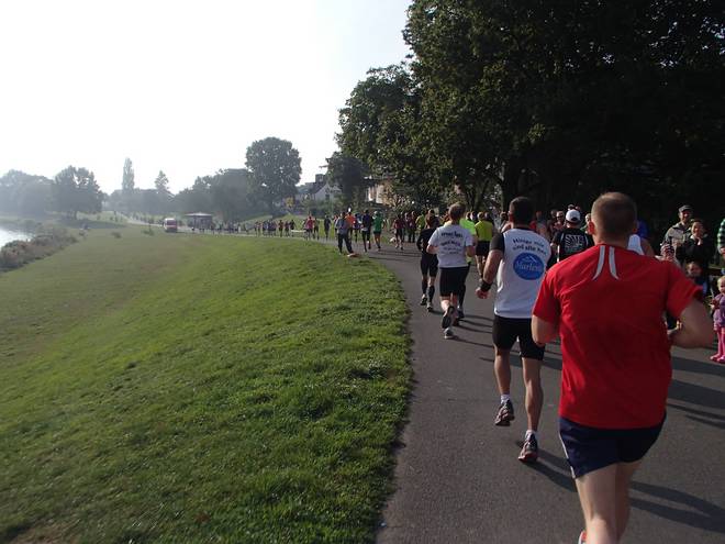 Weserwehr 10.49 Uhr / Km 13,7 Irgendwie hängt meine Startnummer schief. Foto: |