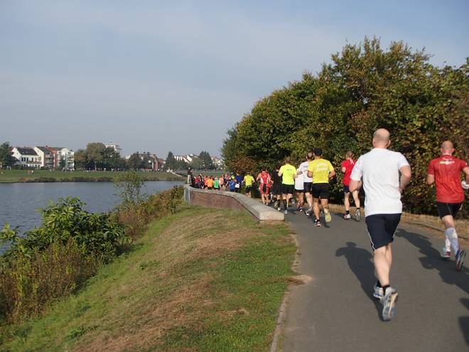 Am Werdersee 10.17 Uhr / Km 6,6 Etwas voraus hatte ich eine Gruppe von drei Läufern ausgemacht, die offenbar wie ich nach vorne durch das Feld liefen. An denen orientierte ich mich nun im weiteren Verlauf. |