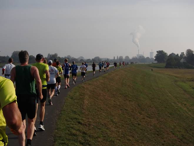 Holzdamm 10.33 Uhr / Km 10,2 Naja... die Grundidee hinter der Tempoverschärfung war es, so bei Km 12 eine Pinkelpause einzulegen und dabei die Dreier-Gruppe nicht wieder vorbeiziehen zu lassen. Ideen gibt es... |