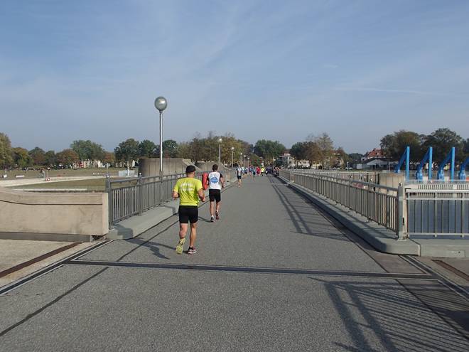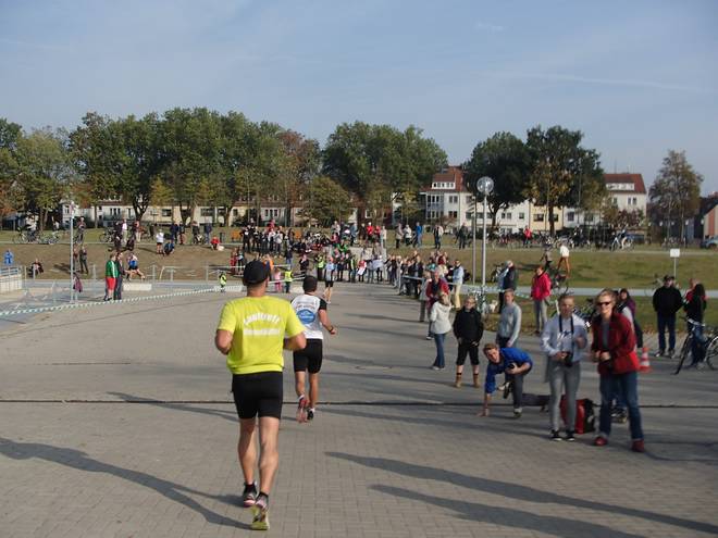 Weserwehr 10.49 Uhr / Km 13,8 Über die Weser waren wir dann rüber. Auf der anderen Seite waren reichlich viele Menschen zum Zugucken gekommen. Insgesamt war an der Strecke viel los. Nicht immer, aber immer mal wieder. |