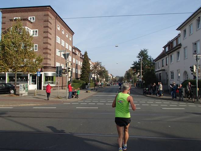 Holzdamm 10.32 Uhr / Km 10,1 Durch das Wohnviertel von Habenhausen, in dem recht viele Zuschauer an der Straße standen, lief ich dann wie entfesselt weiter. Nun war viel Platz auf der Straße und ich konnte nach Herzenslust nach vorne ziehen. |