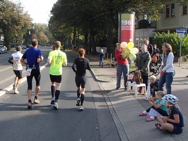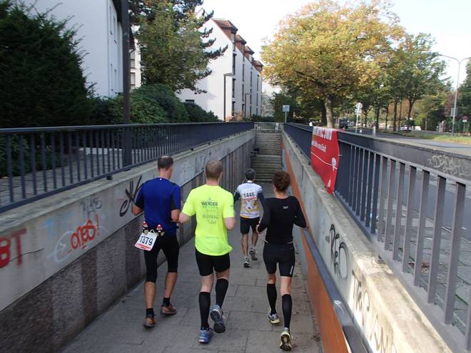 Belfortstraße 11.05 Uhr / Km 17,2 Und dann hatte ich die Drei vom Werder Sports Running Team wieder eingeholt. An Überholen dachte ich zunächst aber nicht. |