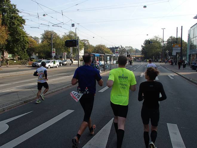 Schwachhauser Heerstraße 11.14 Uhr / Km 19,2 Mich beschäftigte derweil vor allem die Frage, auf welche Zielzeit die Drei da vor mir wohl hinausliefen. Wie ich waren sie am Anfang beim 3:30-Stnden-Pacer gelaufen, um sich (etwas früher als ich) nach vorne dann abzusetzen. Mit dem Tempo jetzt rannten sie aber eher auf unter 3:20 Stunden. Dabei ist berücksichtigt, daß die meisten Läufer sie zweite Hälfte nicht schneller laufen, so wie ich es gerne mache. |