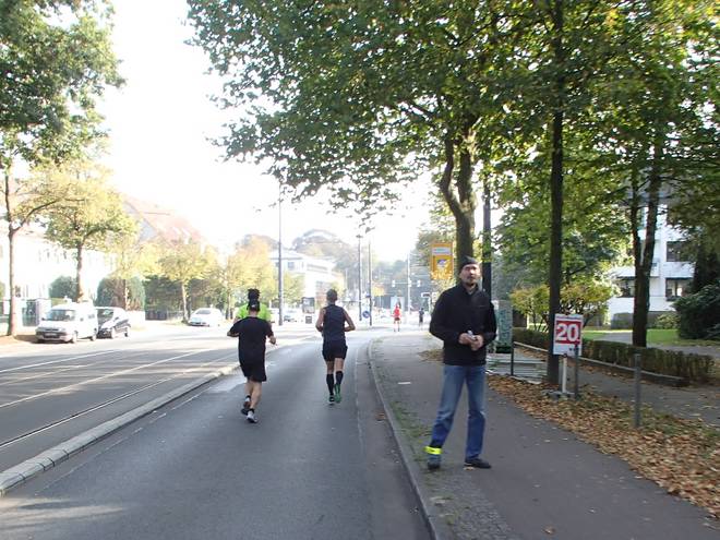 Schwachhauser Heerstraße 11.16 Uhr / Km 19,6 Mit dem Verpflegungsstand bei Km 19,5 hatte sich die Frage dann von alleine erledigt. Ich trank schneller und war jetzt vor der Dreier-Gruppe. Und wie es bei mir üblich ist, zog ich nun nach vorne davon. |