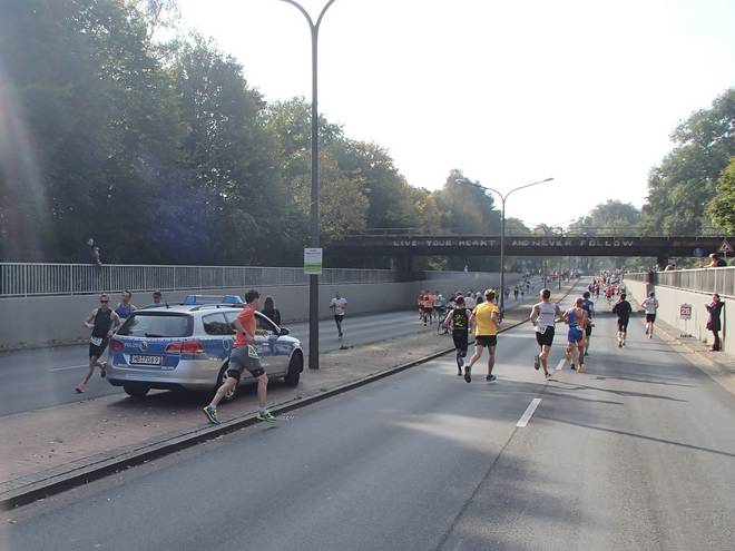 Am Herzogenkamp 11.31 Uhr / Km 23,0 Der Abstand nach vorne wurde sichtbar kürzer. Von Kilometer zu Kilometer bekam ich immer mehr Vorsprung auf die am Anfang mal geplante 3:30-Stunden-Taktik, die ich immer noch als Vergleichswert zugrunde legte. |