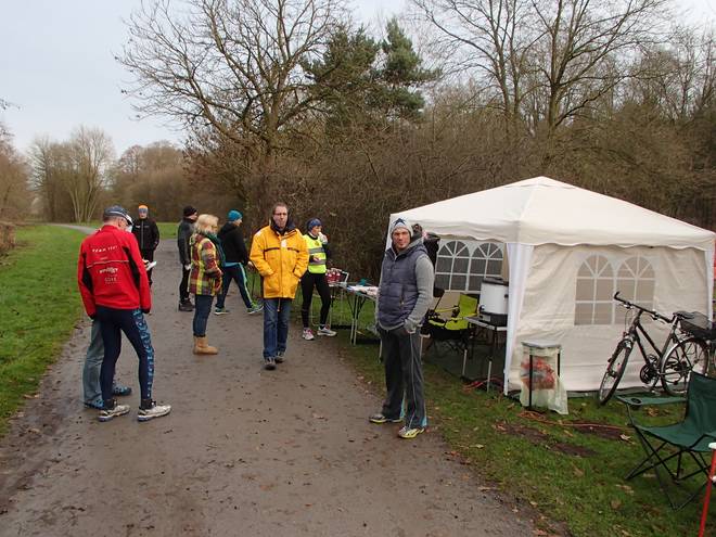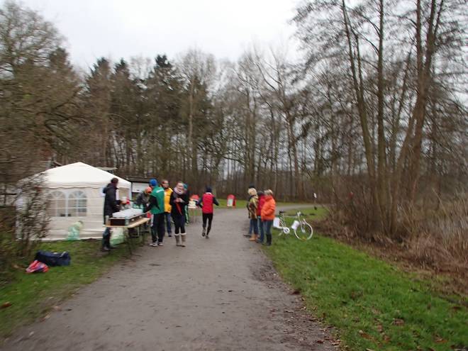 Rubbenbruchsee 10.21 Uhr Jetzt aber erst einmal schnell die Startnummer abgeholt und sich schnell umgezogen. Dafür hätte ich ganz offiziell auch das nahe Café-Restaurant nutzen dürfen, allerdings wollte ich da nicht einer der beiden Toiletten besetzt halten. Und draußen auf dem Parkplatz geht es ja auch. 5° bis 6°C. |