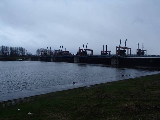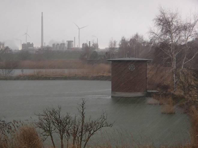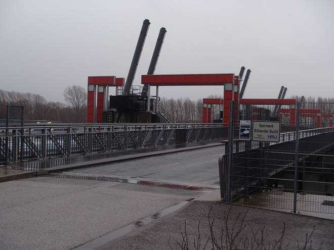 Sperrwerk Billwerder Bucht 9.21 Uhr 3°C und Sturm mit Böen bis zu 88 Km/h. Das entspricht der Windstärke 8 bis 9. Dazu teils heftiger Regen. Bevor ich hier über das Sperrwerk wandern konnte, mußte ich zunächst einen geeigneten Moment abpassen. |