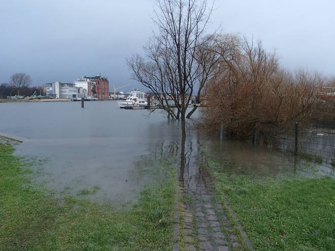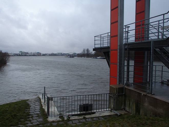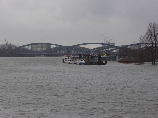 Norderelbe 9.24 Uhr Morgens hatte es in Hamburg wieder eine Sturmflut gegeben. Der traditionelle Fischmarkt fiel wegen "Land unter" sogar komplett aus. Nun lief das Wasser aber wieder ab. |