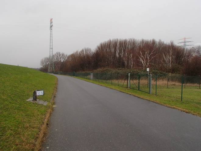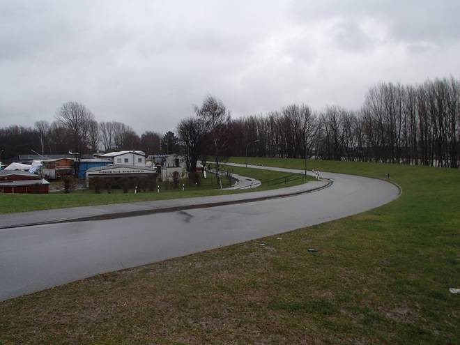 Kaltehofe-Hauptdeich 9.25 Uhr Kaltehofe ist im Prinzip eine Insel, allerdings im Norden und Süden mit einer Brücke bzw. einem Damm mit dem Festland verbunden. Zum Glück war die Insel und damit der Marathon von einem Deich im Westen und dem Sperrwerk im Osten geschützt. |