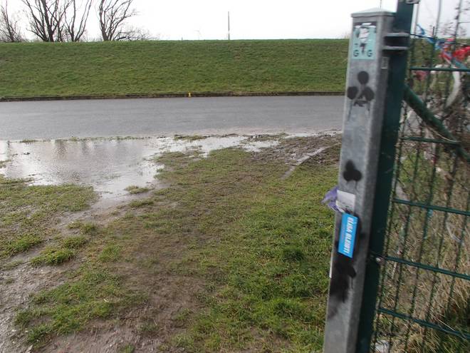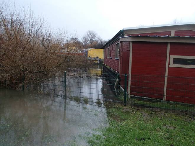 Billwerder Bucht 9.26 Uhr Schutz ist gut, aber man hätte das Sperrwerk vielleicht doch schließen sollen. Hier jedenfalls steht das Wasser doch recht hoch. |
