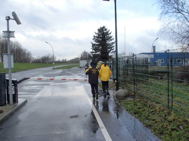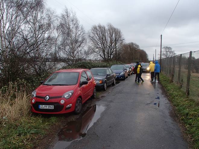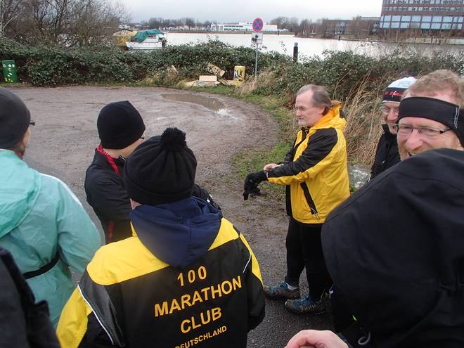 Kaltehofe-Hinterdeich 10.03 Uhr Zum Glück ging organisatorisch alles einigermaßen flott, so daß sich das Warten in der Kälte in Grenzen hielt. Veranstalter Christian erklärt hier noch schnell den Ablauf und erzählt etwas über die Geschichte der Insel und der Wasseraufbereitung. |