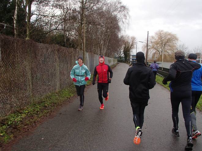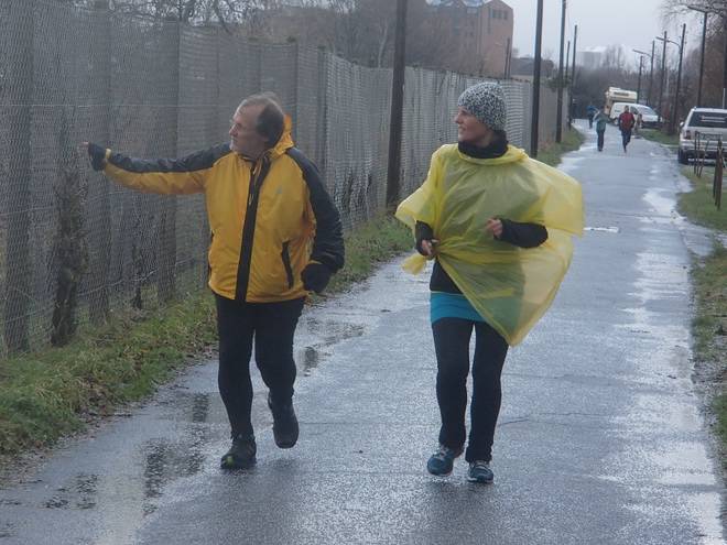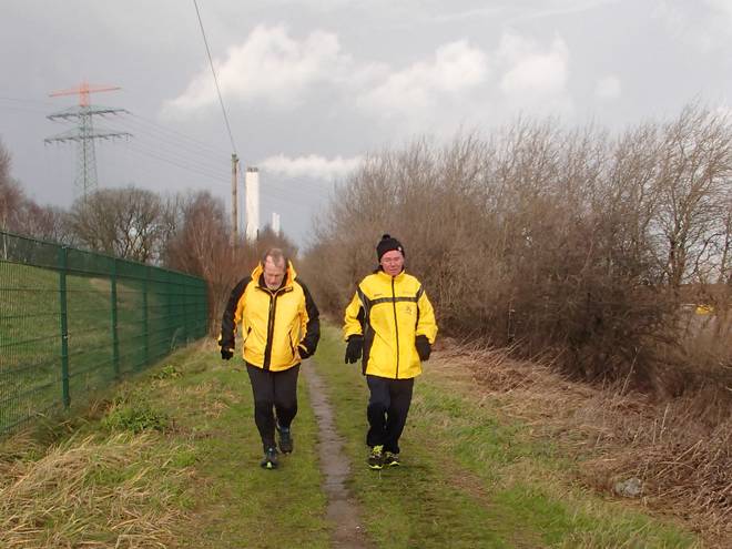 Kaltehofe-Hinterdeich Pendelstück 10.10 Uhr / Km 0,7 Zum Auftakt ein Pendelstück von 700 Metern hin und zurück. Beate und Ralf (links) waren schon auf dem Rückweg. |