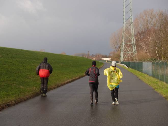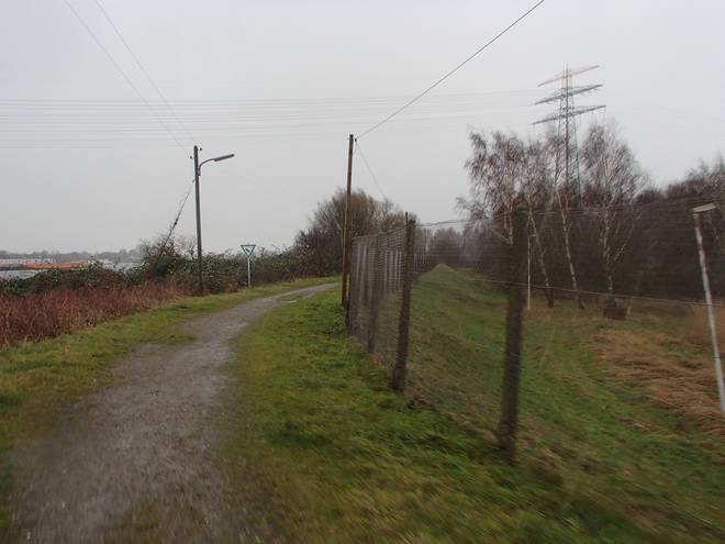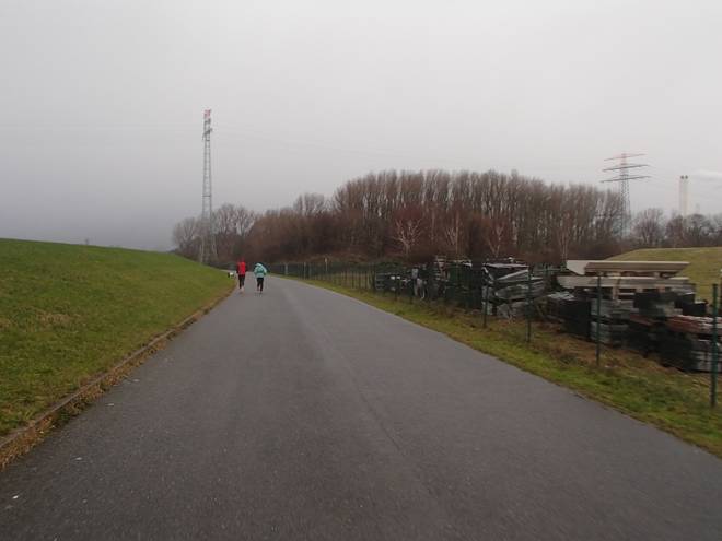 Kaltehofe-Hauptdeich Runde 9 12.55 Uhr / Km 31,1 Es kam nun die Phase, in der es tatsächlich mal etwas trocken war. Bis dahin hatten wir ja inklusive Gewitter und Glatteis auch schon alles gehabt. Es fehlte eigentlich nur noch ein Regenbogen. Aber den gab es nicht. Ode ich hatte ihn trotz aufmerksamen Gucken nicht gesehen. |