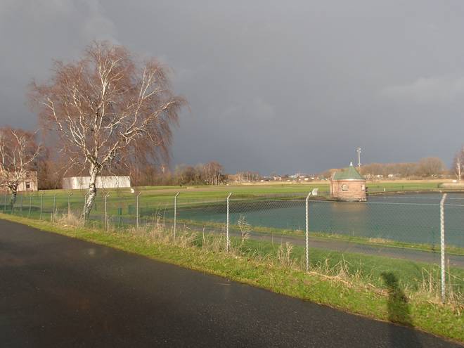 Elbwasserwerk Kaltehofe 13.59 Uhr Kaum hatte ich das Foto mit der Medaille im Kasten fing der Hagel an. |