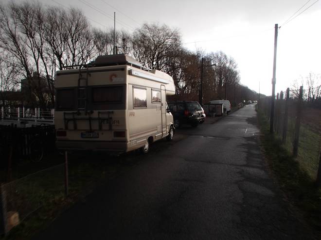 Kaltehofe-Hinterdeich 14.03 Uhr Ich griff mir meine Tasche, die ich klugerweise in einem Müllbeutel trocken gehalten hatte, und marschierte los. Bis zur Bushaltestelle waren es knapp zwei Kilometer. Zum Glück kam der Bus schnell und ich konnte mir dort eine Hose drüber ziehen. |