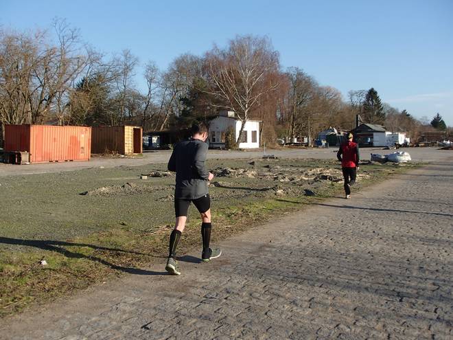 Runde 23 12.36 Uhr / Km 27,4 Irgendwie brachte mich das aus dem Rhythmus. Dazu kam, daß ich hier auf dem Kopfsteinpflaster mein rechter großer Zeh schmerzhaft meldete. Das war nicht so schön, wurde aber ignoriert. Ein wenig den Fuß gedreht und es ging schon. |