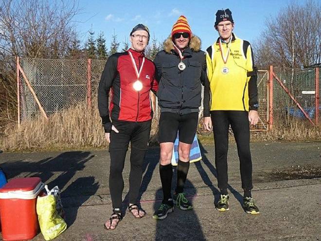 Finish 14.00 Uhr / Km 42,195 Die ersten Drei: links Ralf (3:46:54 Stunden), Mitte Thorsten (3:33:33 Stunden) und rechts ich. Foto: Christian |