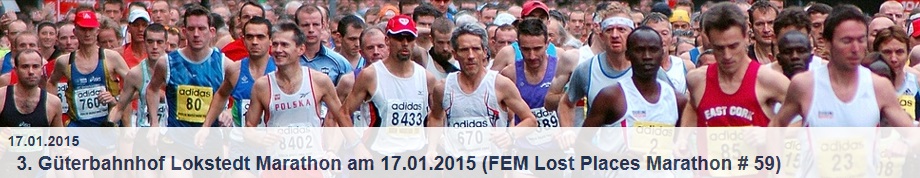Güterbahnhof Lokstedt 10.11 Uhr Wer behauptet immer, ein Marathon sei zu lang für ihn? Man betrachte das Foto: die linke Linie markiert den Start, die rechte Linie das Ziel. Selbst im ungünstigsten Fall sind das weniger als drei Meter. :-) |