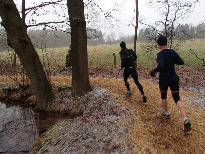Runde 23 11.22 Uhr / Km 16,0 Nun setzte recht heftiger Schneefall ein. Immerhin kein Regen. Wie matschig der Kurs sein kann, wußte ich noch vom Vorjahr. |