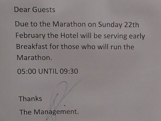 Sliema Marina Hotel 5.50 Uhr Nicht nur, daß mein Hotel nur 20 Meter vom Ziel entfernt lag, es waren auch nur 50 Meter bis zu den Bussen Richtung Start und am Marathonmorgen gab es statt ab 7.30 Uhr schon ab 5.00 Uhr Frühstück. Warum die Zimmerpreise dennoch so unglaublich niedrig waren, konnte ich nicht begreifen. Aber fand ich gut. |