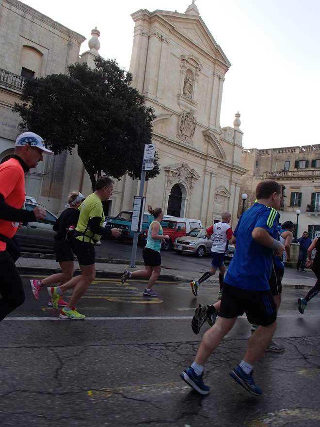 Ir-Rabat Triq Nikol Saura Church St. Sebastian 7.36 Uhr / Km 1,0 Ich hatte mir eigentlich eine Zeit um die 3:40 Stunden vorgestellt. Aber nach dem Vorfall mit dem Durchfall vor dem Start war ich doch vorsichtig geworden. Im Endeffekt wollte ich ja vor allem ins Ziel kommen und die Medaille holen. |