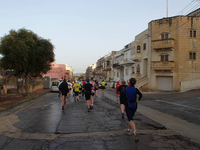 Ir-Rabat Is-Saqqajja 7.32 Uhr / Km 0,2 Am Anfang lief man mit der Masse mit. In der recht schmalen Gasse war es mit Überholen ohnehin schwierig und außerdem raste das Feld wie über sehr schnell los. |