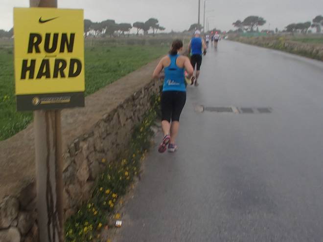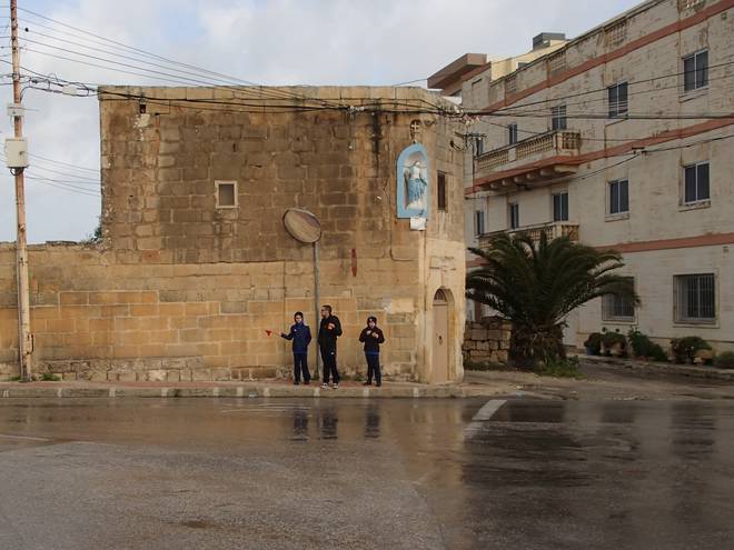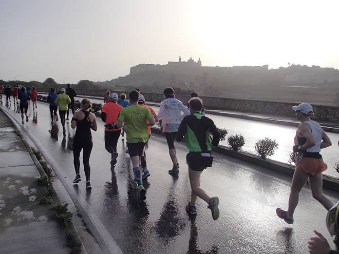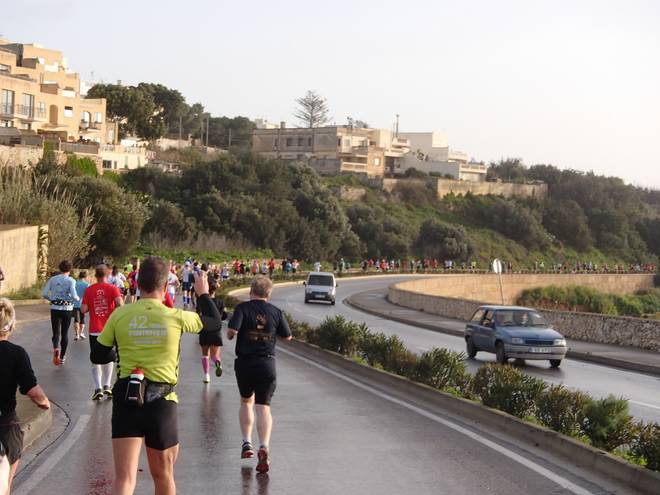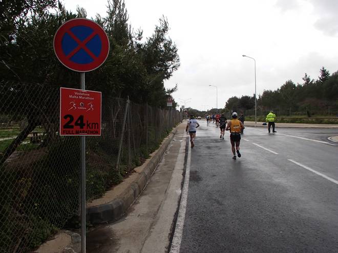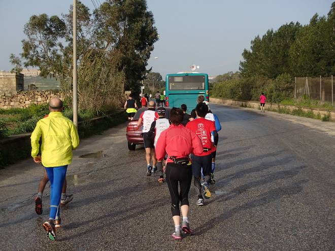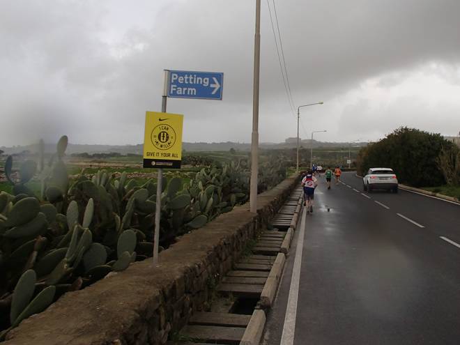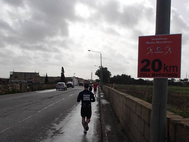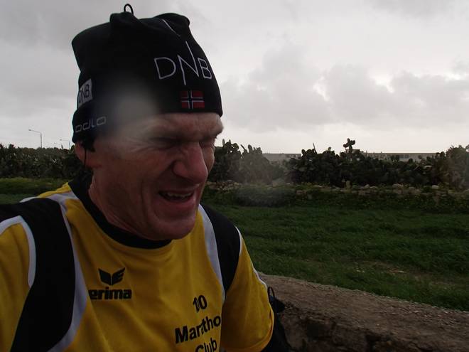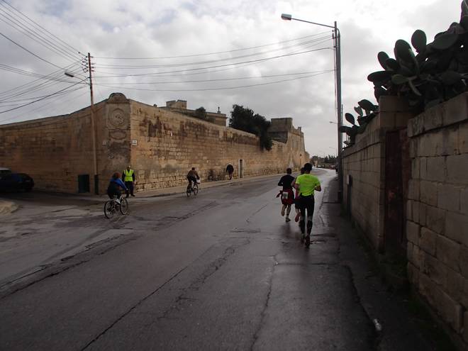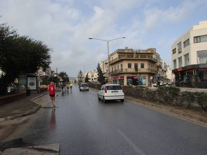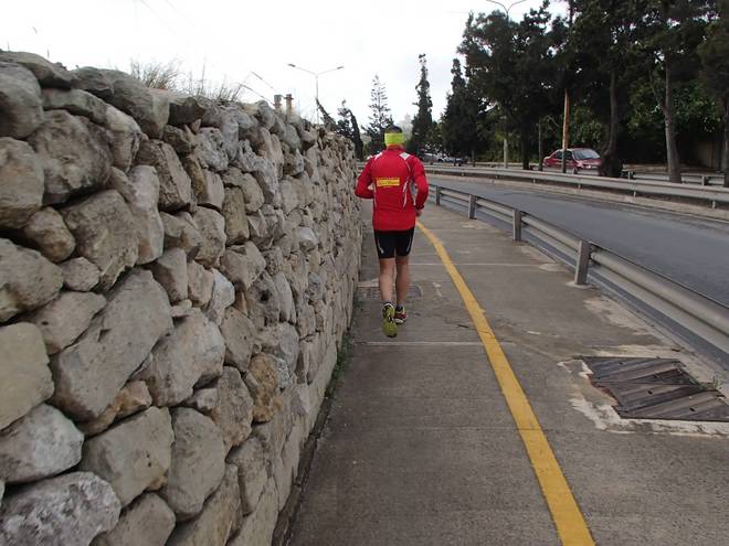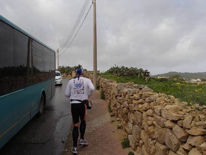 Ħ'Attard Vjal L-Istadium Nazzjonali 9.45 Uhr / Km 25,6 Augen zu und immer an der Mauer entlang. Das würde schon vorbei gehen. Wenn schon nicht der Regen, dann doch zumindest der Wind von vorne. |
