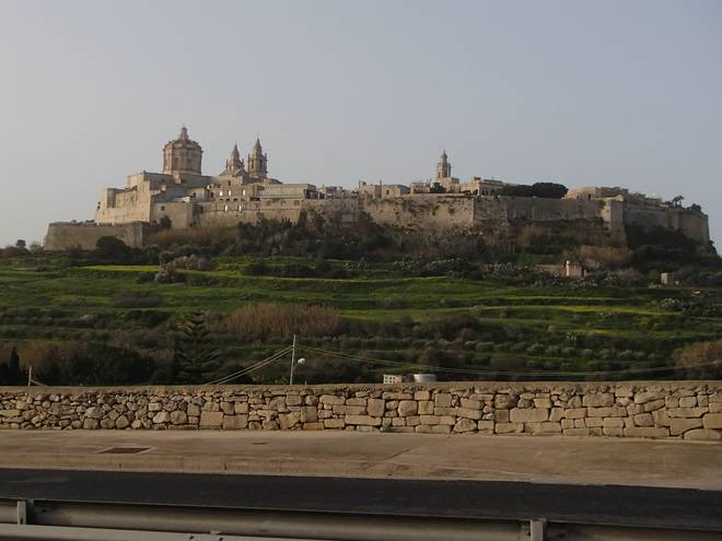 L-Imtarfa Triq Il Maltin Internati U Eziljati 7.45 Uhr / Km 2,8 Schöner Blick hinauf auf die Burg von Mdina. Da vor den Toren waren wir eine Viertelstunde zuvor gestartet. |