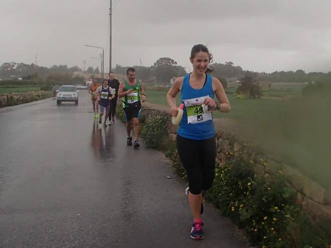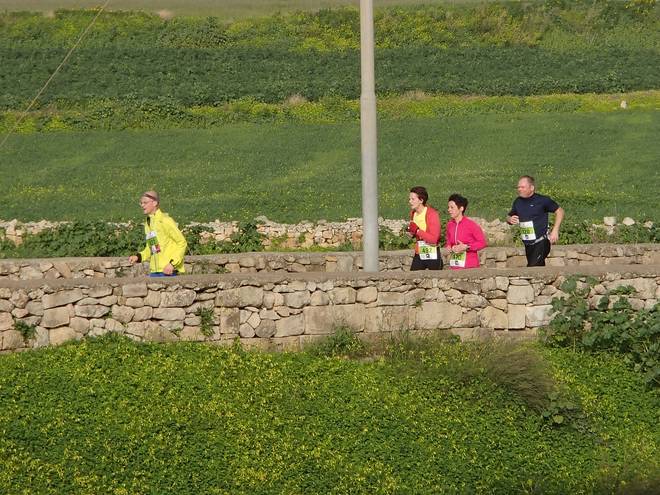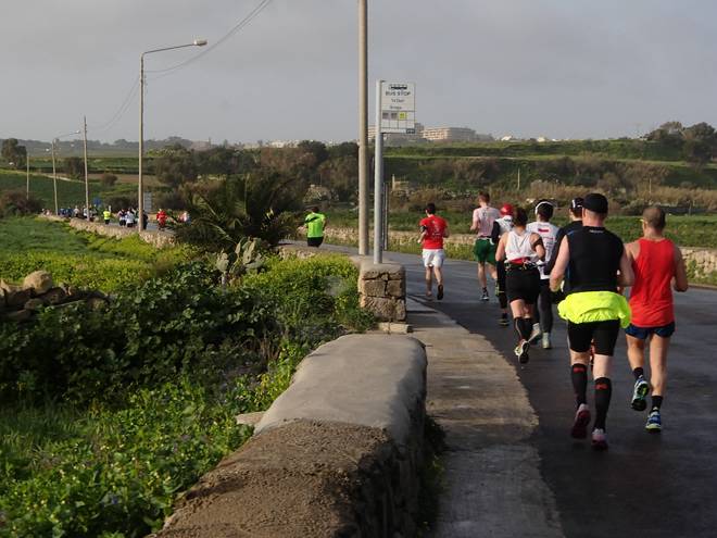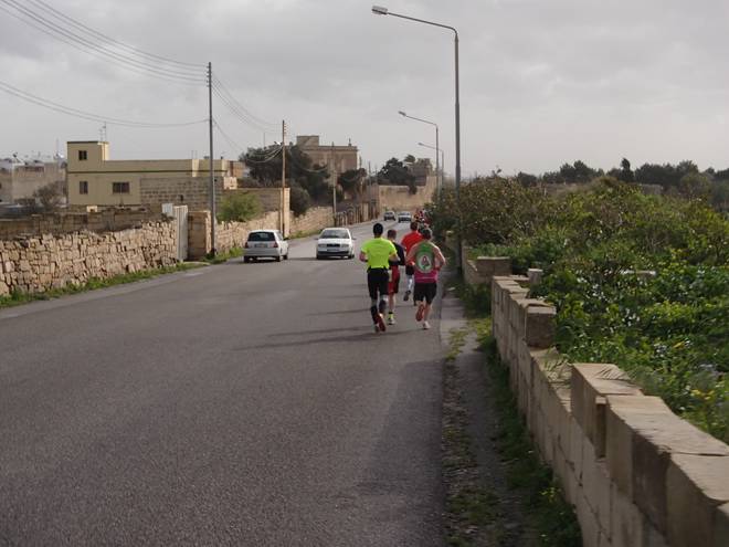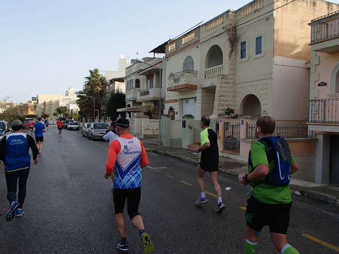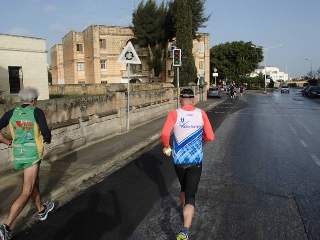 Ħ'Attard Hemsija 7.59 Uhr / Km 5,4 Bei diesen Foto kam ich an meine Grenzen. Der Läufer in Blau in der Mitte überholte mich kurz danach und blieb dann lange bei mir. Den Läufer in Schwarz und Weiß hatte ich gerade überholt (ich habe ja weit mehr Fotos als hier zu sehen sind). Also muß dieses Foto ziemlich genau bei Km 5,4 gemacht worden sein, nur war da keine Kreuzung und kein Kreisel. |