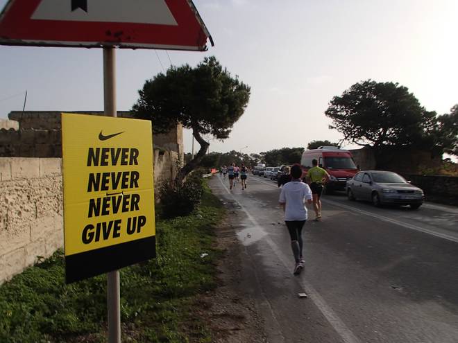 Ħ'Attard Vjal L-Istadium Nazzjonali 9.43 Uhr / Km 25,2 "I can. I will. Give it your all." Aber das obere Schild war auch nicht übel. |