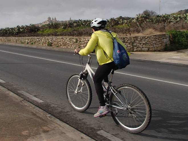 Ir-Rabat Triq Buqana 9.04 Uhr / Km 17,7 Ich hatte aber auch Hilfe. Die zweite Hälfte dieses Weges lieferte ich mir ein nettes Duell mit dieser Fahrradfahrerin. Am Ende war ich vor ihr oben, aber für dieses Foto mit der Burg von Mdina im Hintergrund ließ ich mich noch kurz zurückfallen. |