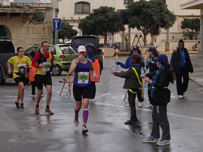 Ħ'Attard Triq L-Imdina 8.28 Uhr / Km 11,0 Als dann kurz danach kleine Fläschchen mit Iso angeboten wurde, griff ich dann doch zu. Da war wohl ein zehntel Liter drin. |