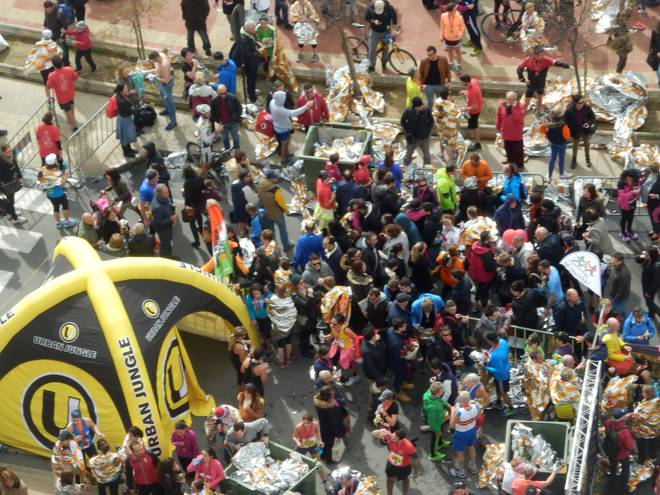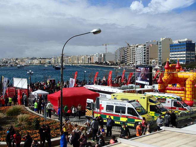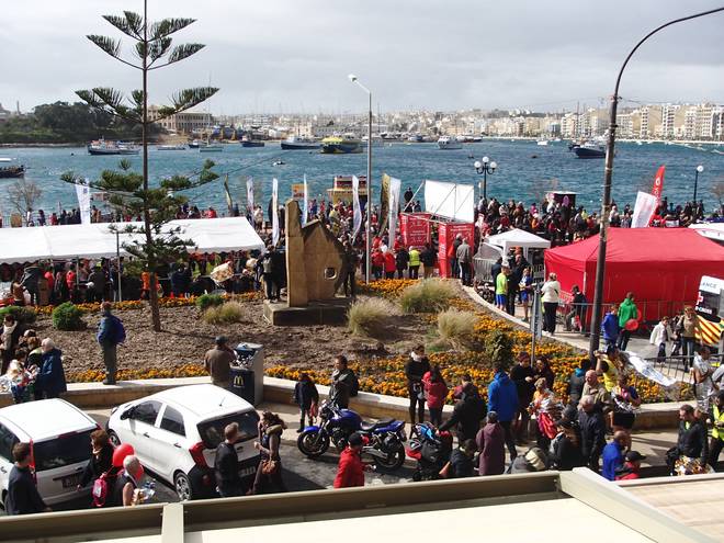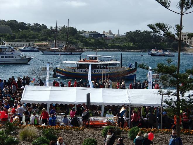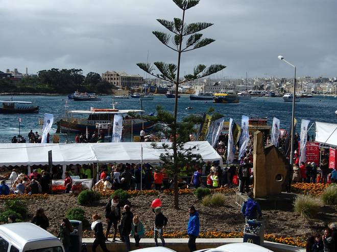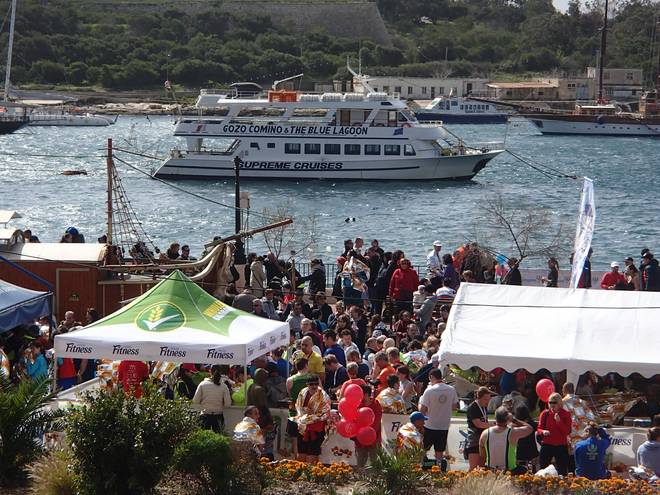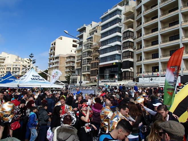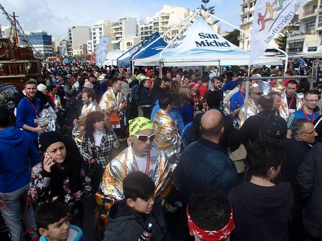 Tas-Sliema 11.14 Uhr Aus diesem Gewühl im Ziel mußte man erst einmal heraus kommen. Das war ja wie Florenz 2013. Nur gab es hier niemanden, der einen ständig anmeckerte, wenn man nicht schneller ging als es die stehende Masse möglich machte. |